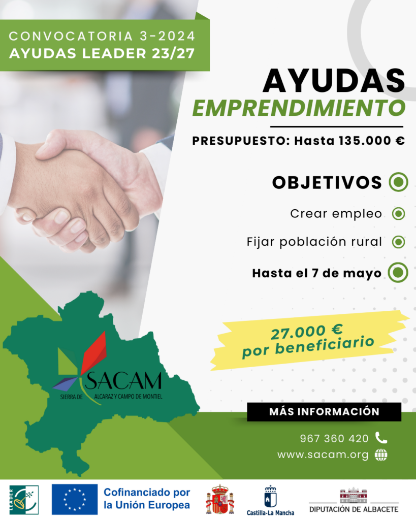 La Asociación Grupo de Desarrollo Rural Sierra de Alcaraz y Campo de Montiel (SACAM) ha abierto el plazo de solicitudes para la Convocatoria de Ayudas al Emprendimiento 3-2024, dentro del marco del Plan Estratégico de la PAC (PEPAC) 2023-2027. Esta línea de apoyo está dirigida a personas desempleadas que deseen iniciar una nueva actividad económica en el medio rural, con una dotación inicial de 108.000 euros, ampliable a 135.000 euros.