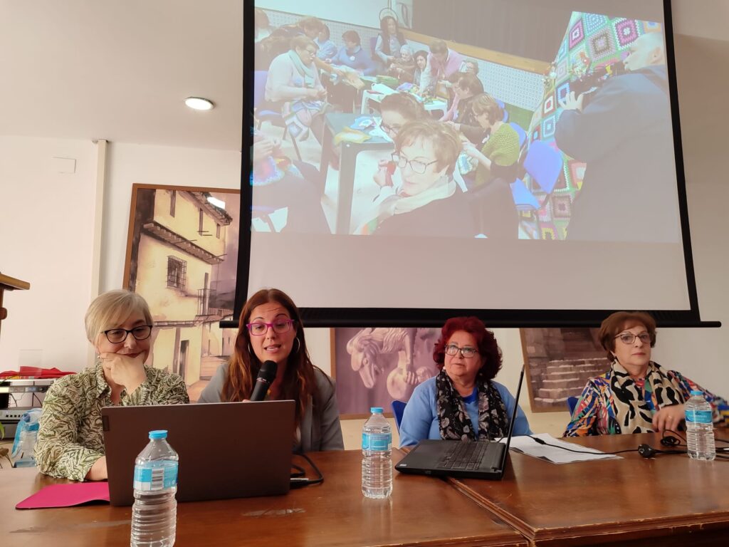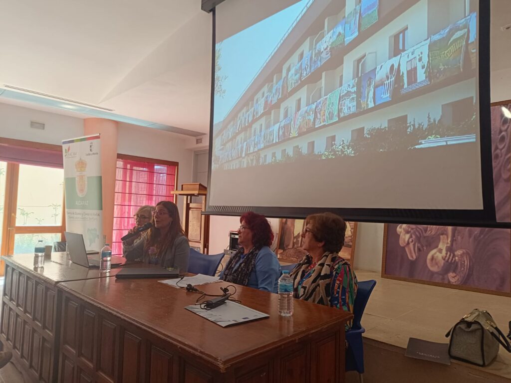Tras la presentación del proyecto, la jornada continuó con la exposición de experiencias vinculadas al arte y la tradición textil femenina. Cristina Vico, técnica de Cultura de la ADR Sierra Mágina, fue la encargada de presentar tres iniciativas desarrolladas en esta comarca jiennense: “Enganchadas de un hilo”, centrada en visibilizar labores tradicionales como el ganchillo o el bordado realizadas históricamente por mujeres; “Balcón&Arte Mágina”, que transforma espacios públicos en museos al aire libre con participación de colectivos sociales; y “Lavaderos de Mágina”, una propuesta que busca dar a conocer, a través de la memoria de las vecinas, cómo era el uso y la vida en los lavaros públicos.